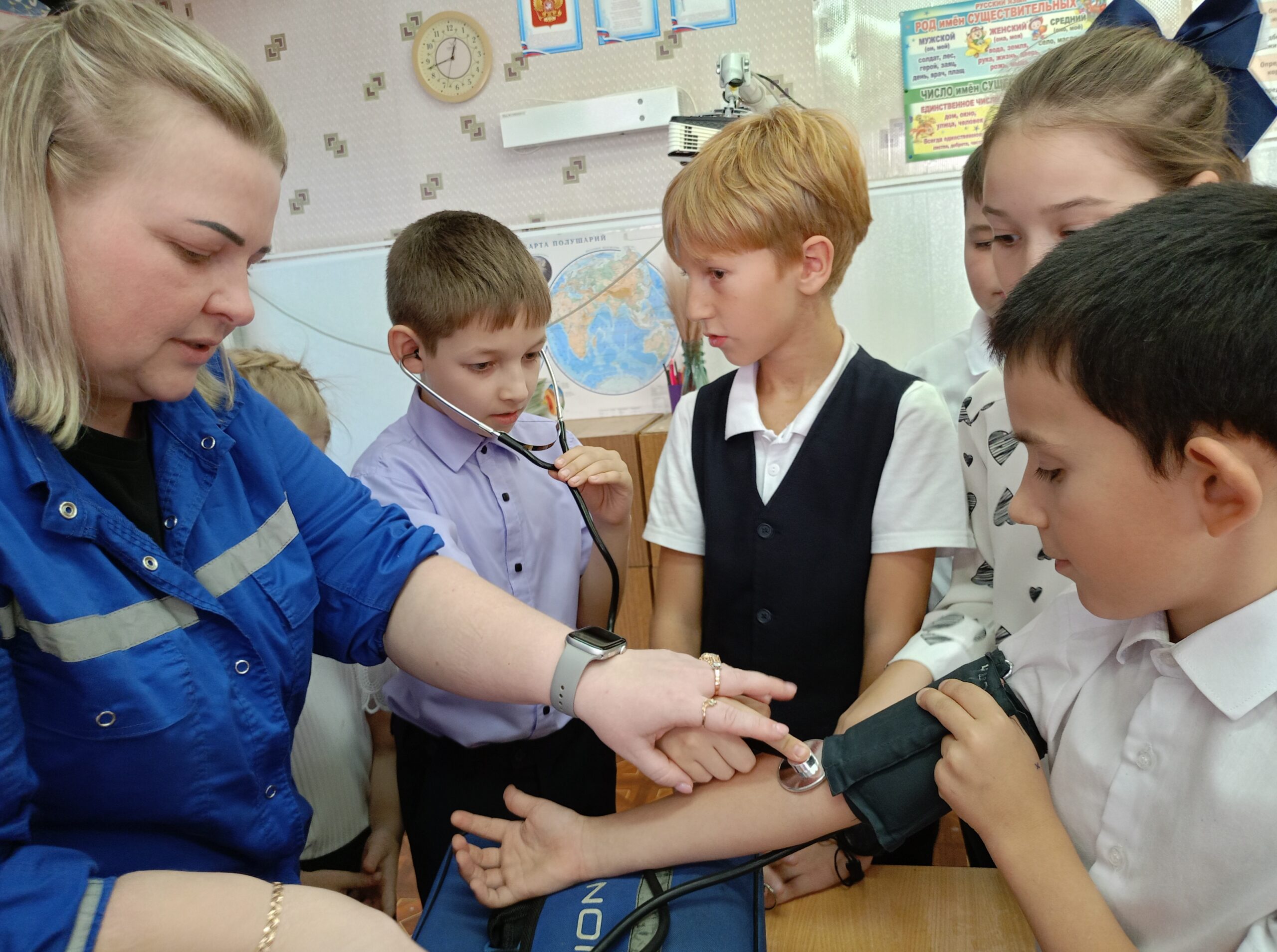 Когда Оксана Владимировна вошла в класс, её встретили любопытные взгляды детей. На ней была форма, а в руках медицинская сумка, полная инструментов и материалов. Дети узнали, что фельдшер — это не просто помощник врача, а самостоятельный специалист, который может принимать важные решения в экстренных ситуациях. Ребята были поражены тем, как много знаний и навыков необходимо для этой профессии.